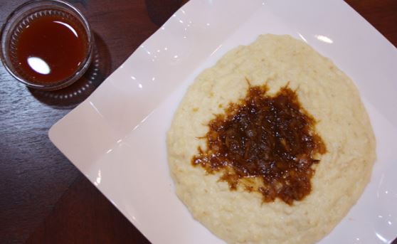 - نَضع الكميّة المتبقية من الزبدة والنعناع في وعاء التقديم، ثمّ نسكب خليط الجريش واللبن الزبادي في الوعاء.